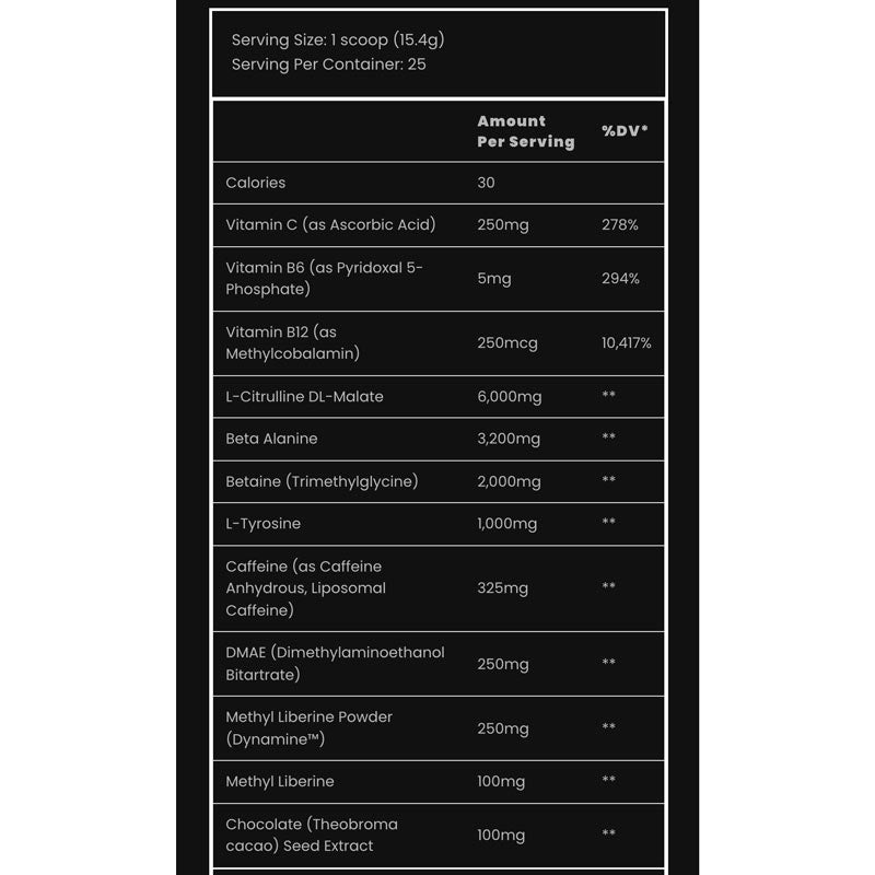 - The formula includes key ingredients like L-Citrulline Malate for pumps, Beta Alanine for endurance, and Caffeine for energy.