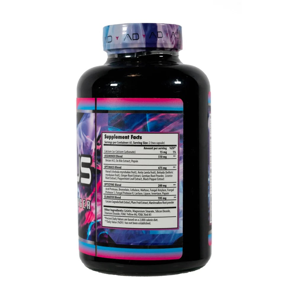 Betain HClOx Bile ExtractPepsinHarad (chebula myrobalan fruit)Amla (amla fruit)Behada (belleric myrobalan fruit)Ginger Root ExtractGentian Root PowderLicorice Root ExtractPeppermint Leaf ExtractBlack Pepper ExtractAcid ProteaseBromelainCellulaseMaltaseFungal AmylaseFungal Protease IFungal Protease IILactaseLipaseInvertasePapainCascara Sagrada Bark ExtractPlum Fruit ExtractMarshmallow Root powder