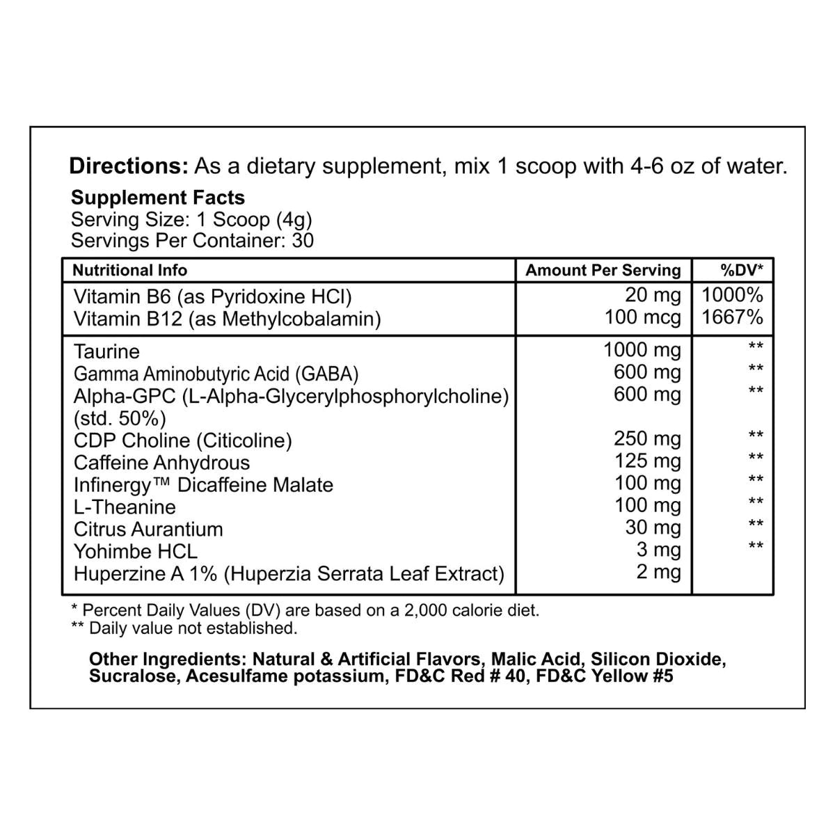 | Huperzine A 1% (Huperzia Serrata Leaf Extract) | 2 mg |