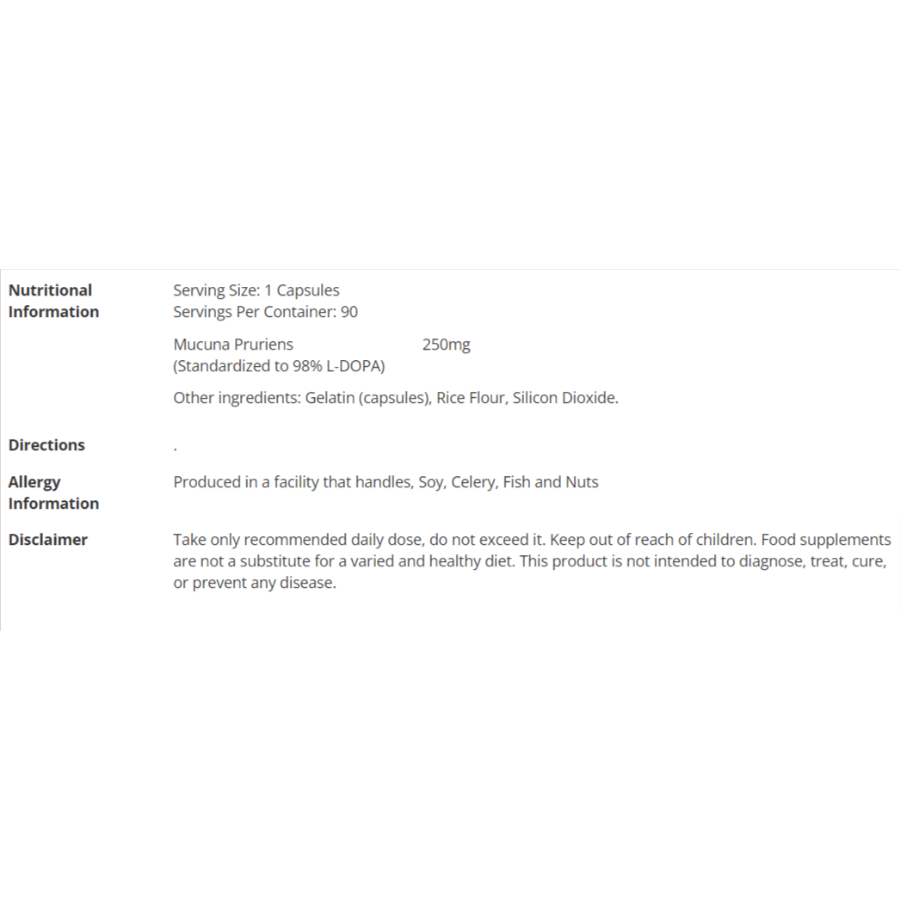 | Mucuna Pruriens (Standardized to 98% L-DOPA) | 250 mg |