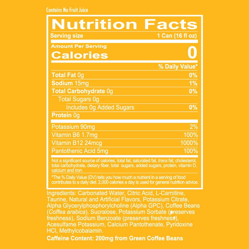 Carbonated WaterCitric AcidL-CarnitineTaurineNatural and Artificial FlavorsPotassium CitrateAlpha Glycerylphosphorylcholine (Alpha GPC)Coffee Beans (Coffea arabica)SucralosePotassium Sorbate (preserves freshness)Sodium Benzoate (preserves freshness)Acesulfame PotassiumCalcium PantothenatePyridoxine HClMethylcobalamin