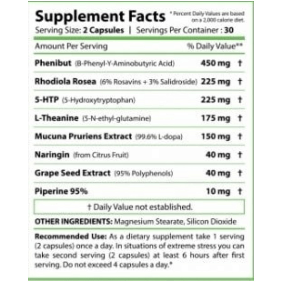 | Phenibut (B-Phenyl-Y-Aminobutyric Acid) | 450 mg |
