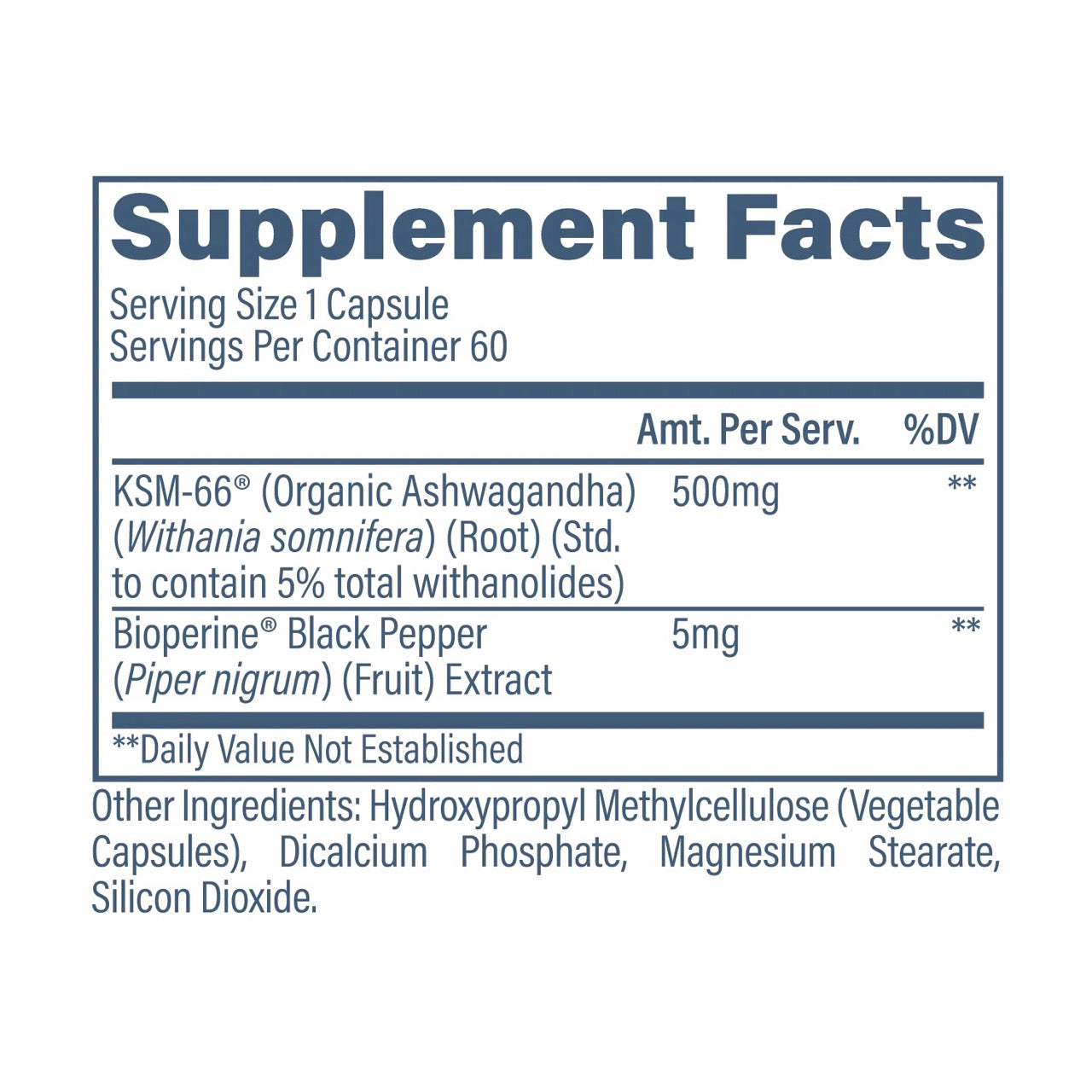 | KSM-66® (Organic Ashwagandha) (Withania somnifera) (Root) (Std. to contain 5% total withanolides) | 500 mg |