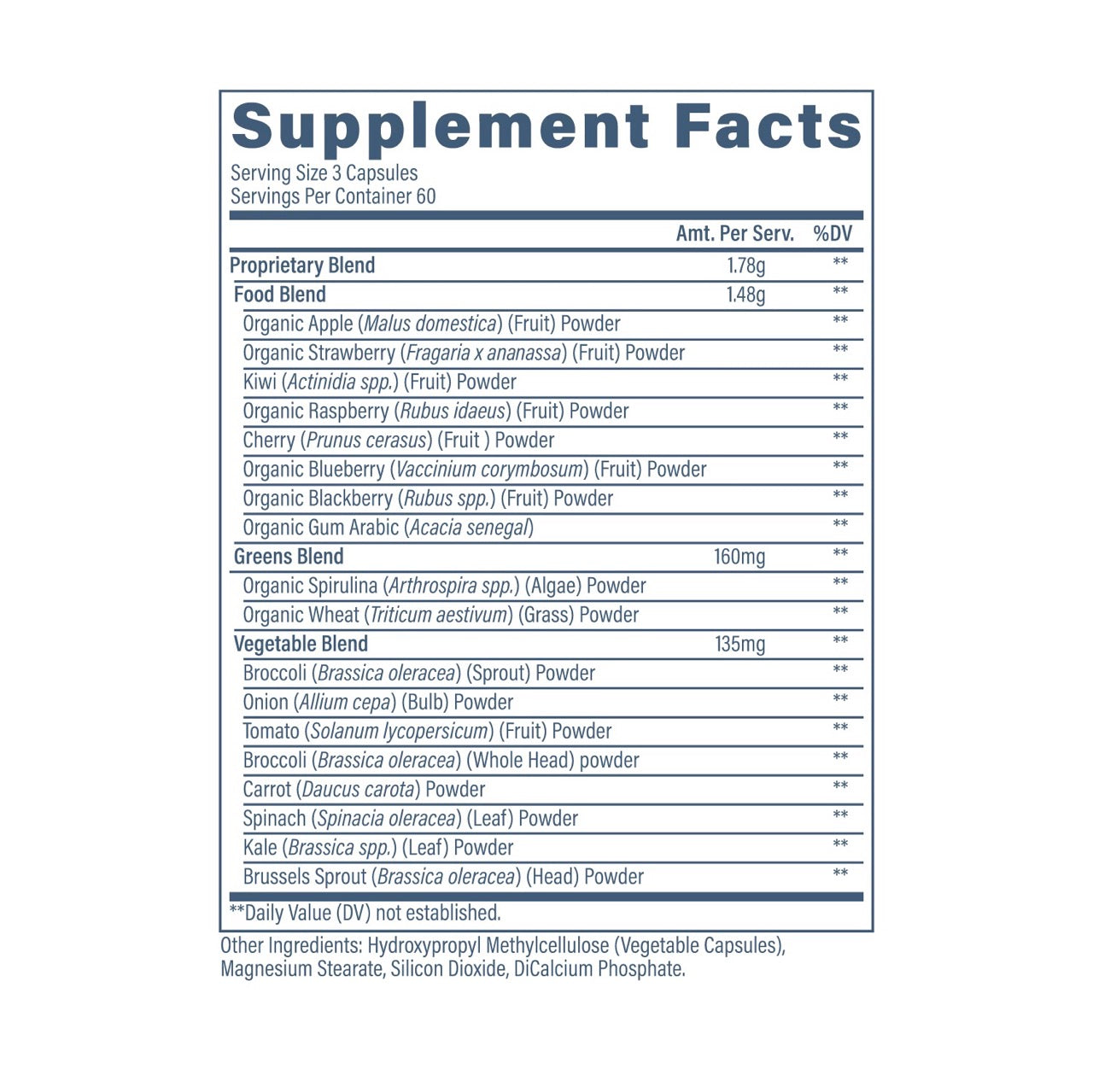 Organic Apple (Malus domestica) (Fruit) PowderOrganic Strawberry (Fragaria x ananassa) (Fruit) PowderKiwi (Actinidia spp.) (Fruit) PowderOrganic Raspberry (Rubus idaeus) (Fruit) PowderCherry (Prunus cerasus) (Fruit) PowderOrganic Blueberry (Vaccinium corymbosum) (Fruit) PowderOrganic Blackberry (Rubus spp.) (Fruit) PowderOrganic Gum Arabic (Acacia senegal)Organic Spirulina (Arthrospira spp.) (Algae) PowderOrganic Wheat (Triticum aestivum) (Grass) PowderBroccoli (Brassica oleracea) (Sprout) PowderOnion (Allium cepa) (Bulb) PowderTomato (Solanum lycopersicum) (Fruit) PowderBroccoli (Brassica oleracea) (Whole Head) PowderCarrot (Daucus carota) PowderSpinach (Spinacia oleracea) (Leaf) PowderKale (Brassica spp.) (Leaf) PowderBrussels Sprout (Brassica oleracea) (Head) Powder