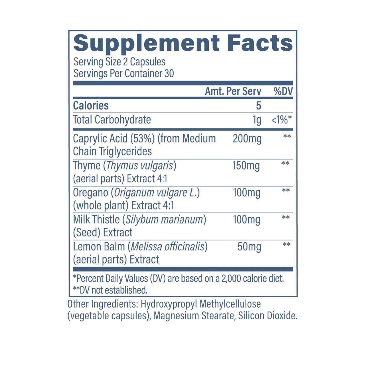 | Caprylic Acid (53%) (from Medium Chain Triglycerides) | 200 mg |