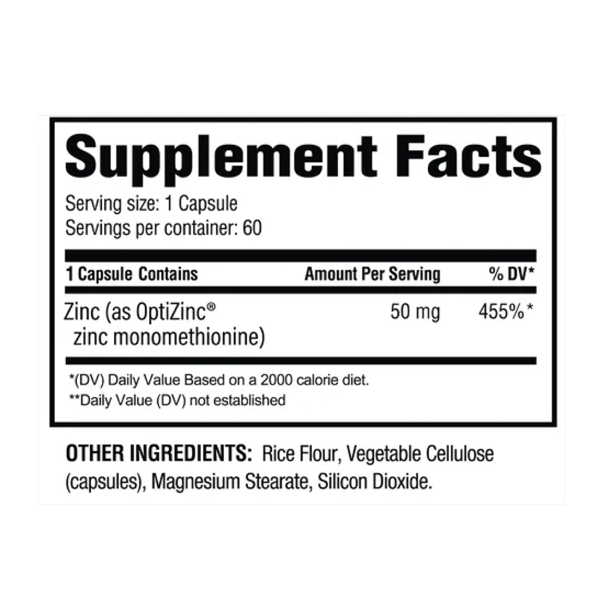 | Zinc (as OptiZinc® zinc monomethionine) | 50 mg |
