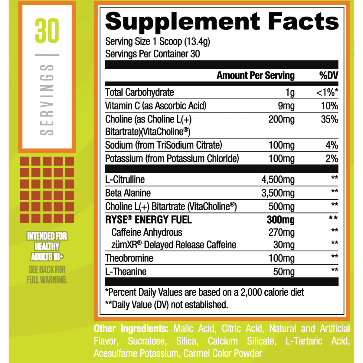 Ryse Pump delivers a comprehensive blend of ingredients known for promoting muscle pumps, energy, and focus. Includes L-Citrulline, a key ingredient for nitric oxide production and enhanced blood flow. Contains Beta Alanine to support muscular endurance and reduce fatigue. Features a multi-source caffeine blend (Caffeine Anhydrous, zümXR Delayed Release Caffeine) combined with L-Theanine for sustained energy and focus without excessive jitters. Incorporates Choline L(+) Bitartrate (VitaCholine) for cognitive support and mental clarity.