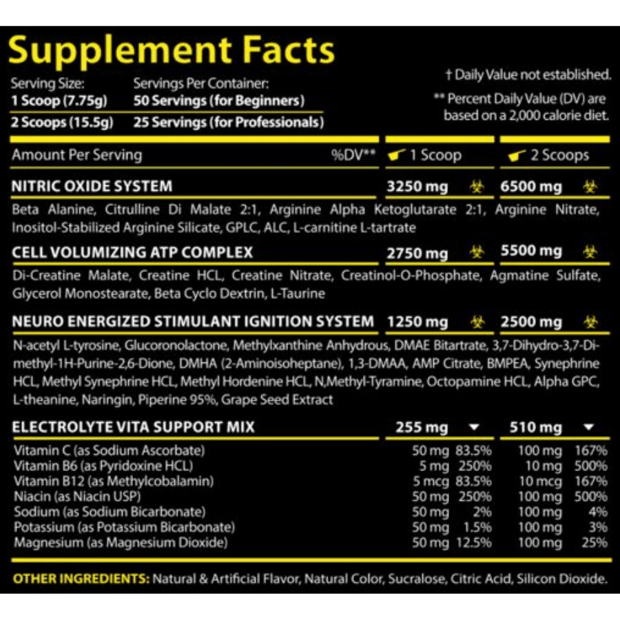 Beta AlanineCitrulline Di Malate 2:1Arginine Alpha Ketoglutarate 2:1Arginine NitrateInositol-Stabilized Arginine SilicateGPLCALCL-carnitine L-tartrateDi-Creatine MalateCreatine HCLCreatine NitrateCreatinol-O-PhosphateAgmatine SulfateGlycerol MonostearateBeta Cyclo DextrinL-TaurineN-acetyl L-tyrosineGlucoronolactoneMethylxanthine AnhydrousDMAE Bitartrate3,7-Dihydro-3,7-Di-methyl-1H-Purine-2,6-DioneDMHA (2-Aminoisoheptane)1,3-DMAAAMP CitrateBMPEASynephrine HCLMethyl Synephrine HCLMethyl Hordenine HCLN,Methyl-TyramineOctopamine HCLAlpha GPCL-theanineNaringinPiperine 95%Grape Seed Extract