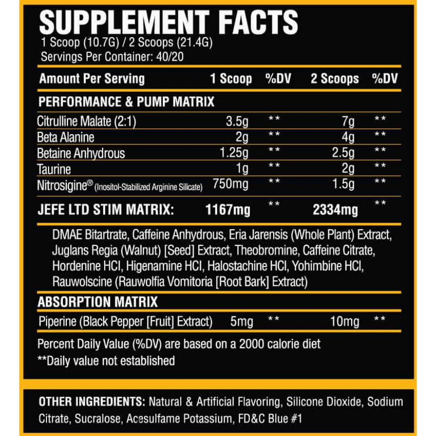 SAMPLE El Jefe Limited Edition V3 1 SCOOP is classified as Extreme intensity. This is a maximum intensity pre-workout containing exotic stimulants. It is designed for experienced users only and should not be used daily.
