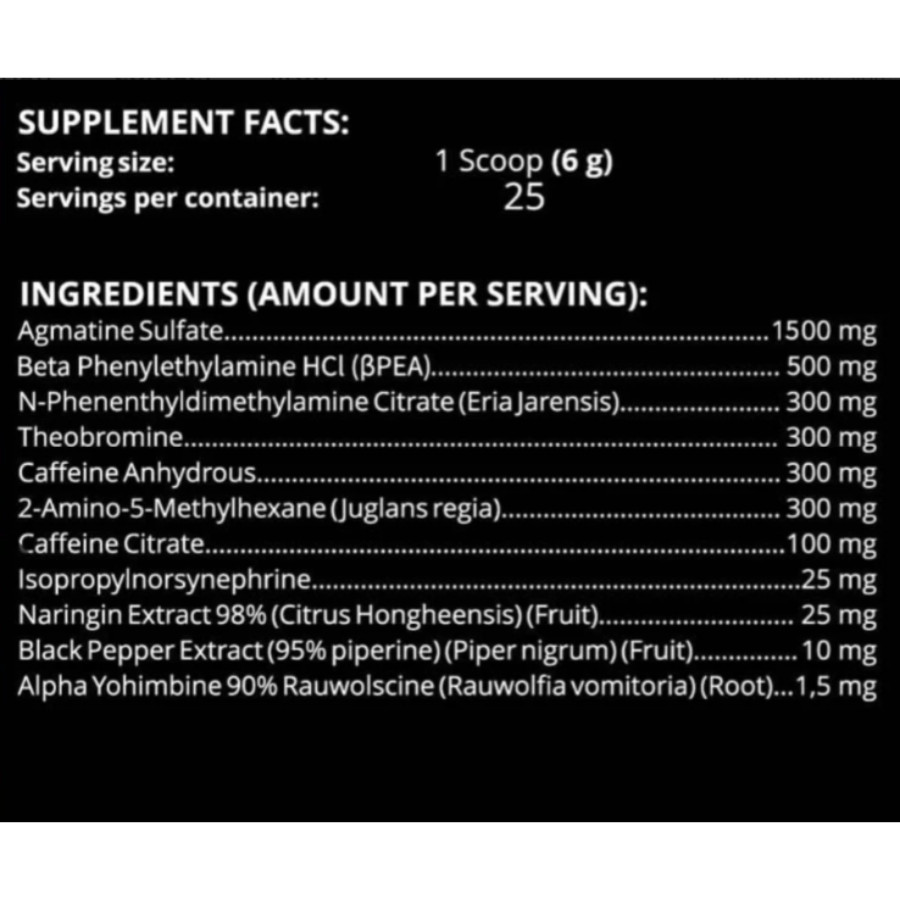 Maximum intensity warning! Contains exotic stimulants (DMHA, DMBA, DMAA) for experienced users only. Not for daily use – cycle with milder options throughout your week. Handle with respect.
