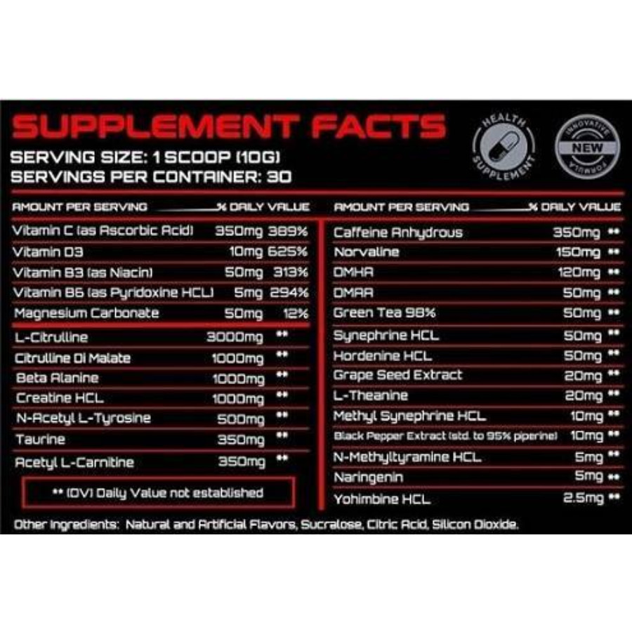 - Includes strong stimulants such as Caffeine Anhydrous, DMHA, and DMAA for an intense experience.