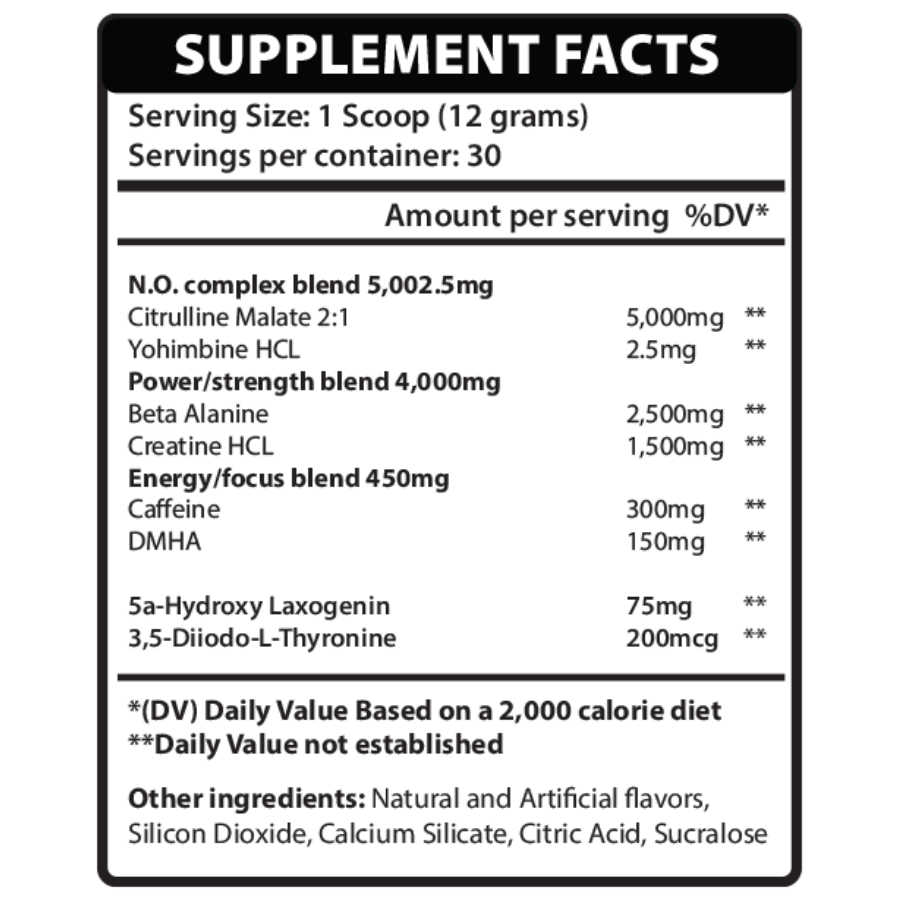 Maximum intensity warning! Contains exotic stimulants (DMHA, DMBA, DMAA) for experienced users only. Not for daily use – cycle with milder options throughout your week. Handle with respect.