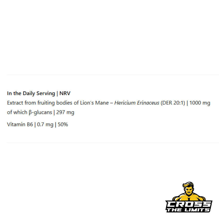 | Extract from fruiting bodies of Lion's Mane – Hericium Erinaceus (DER 20:1) | 1,000 mg |