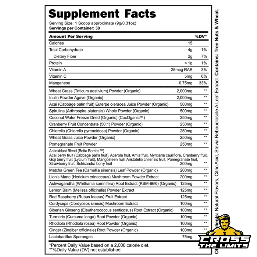 | Wheat Grass (Triticum aestivum) Powder (Organic) | 2,000 mg |