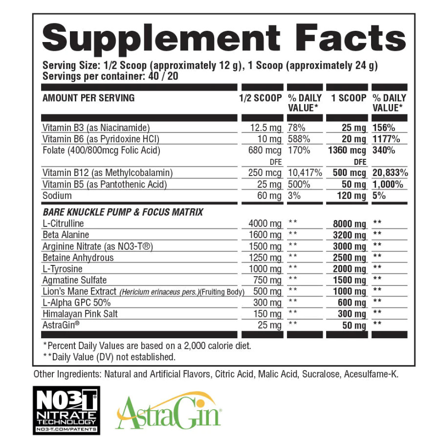 Apollon Nutrition Bare Knuckle Stim Free Pre-workout 40/20 Servings offers a unique stimulant-free experience, providing a 'super stimulated' feeling for training without caffeine, as highlighted by user feedback. Features a robust blend of pump-enhancing ingredients, including L-Citrulline, Arginine Nitrate (NO3-T®), Betaine Anhydrous, and Agmatine Sulfate. Includes cognitive support components like L-Tyrosine, Lion's Mane Extract, and L-Alpha GPC to aid focus during workouts. Contains AstraGin® to support the absorption of key nutrients. Provides essential B vitamins for energy metabolism and overall bodily functions.