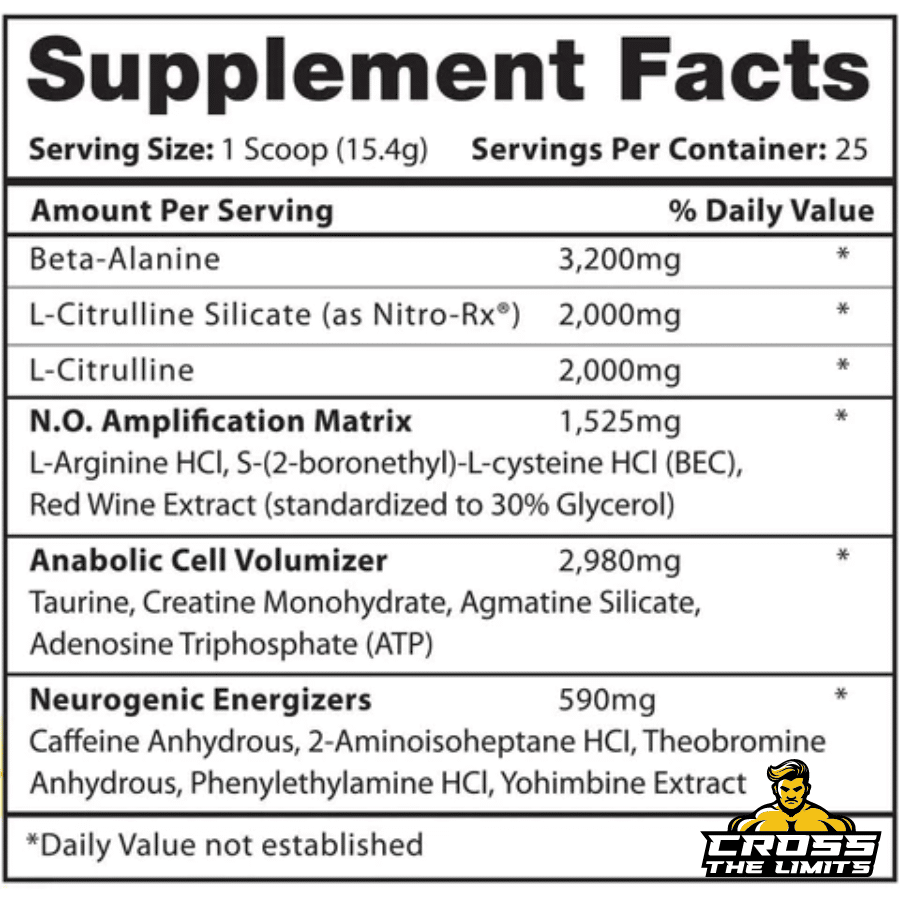 L-Arginine HClS-(2-boronetyl)-L-cysteine HCl (BEC)Red Wine Extract (standardized to 30% Glycerol)TaurineCreatine MonohydrateAgmatine SilicateAdenosine Triphosphate (ATP)Caffeine Anhydrous2-Aminoisoheptane HClTheobromine AnhydrousPhenylethylamine HClYohimbine Extract