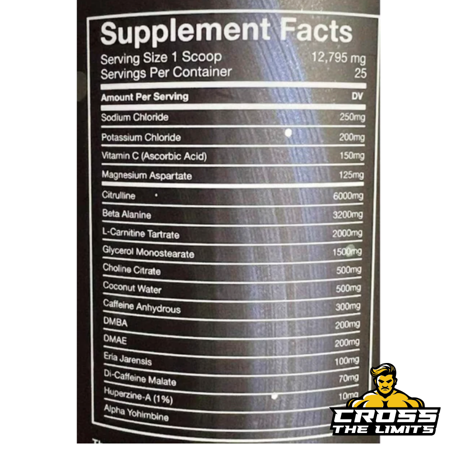 Sodium ChloridePotassium ChlorideVitamin C (Ascorbic Acid)Magnesium AspartateCitrullineBeta AlanineL-Carnitine TartrateGlycerol MonostearateCholine CitrateCoconut WaterCaffeine AnhydrousDMBADMAEEria JarensisDi-Caffeine MalateHuperzine-A (1%)Alpha Yohimbine