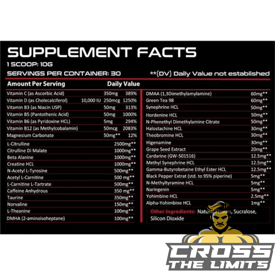 | DMAA (1,3Dimethylamylamine) | 60 mg |