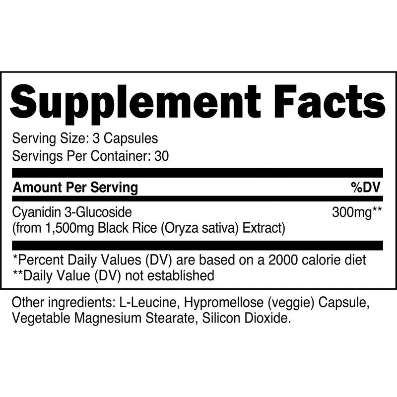 | Cyanidin 3-Glucoside (from 1,500mg Black Rice (Oryza sativa) Extract) | 300 mg |