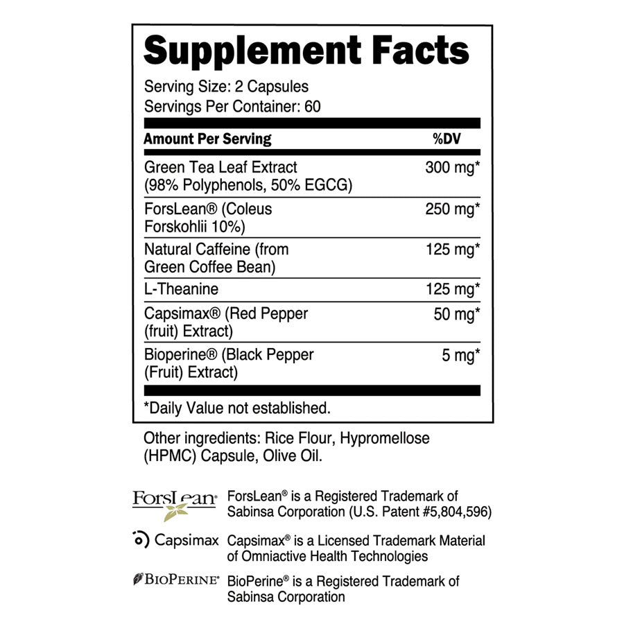 | Green Tea Leaf Extract (98% Polyphenols, 50% EGCG) | 300 mg |
