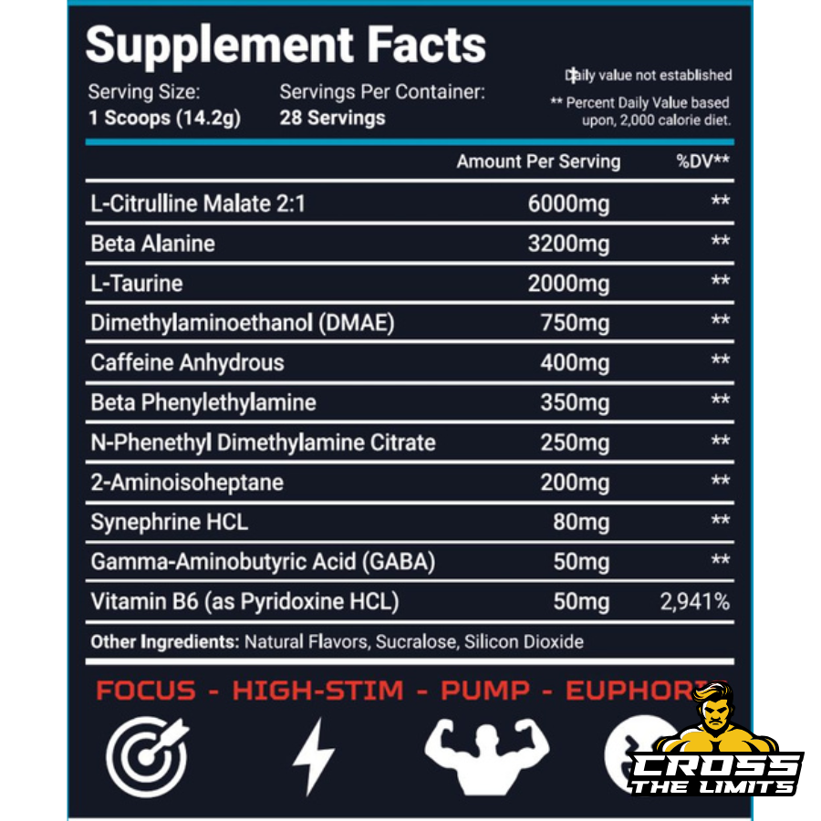 Maximum intensity warning! Contains exotic stimulants (DMHA, DMBA, DMAA) for experienced users only. Not for daily use – cycle with milder options throughout your week. Handle with respect.
