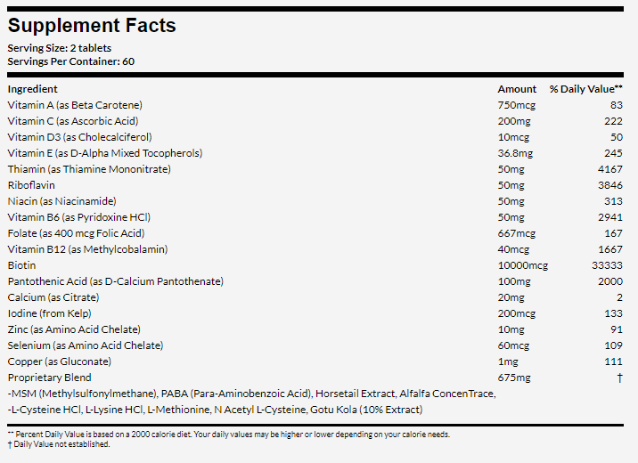 MSM (Methylsulfonylmethane)PABA (Para-Aminobenzoic Acid)Horsetail ExtractAlfalfa ConcenTraceL-Cysteine HClL-Lysine HClL-MethionineN Acetyl L-CysteineGotu Kola (10% Extract)
