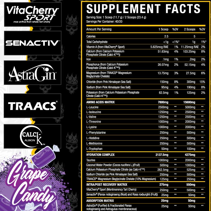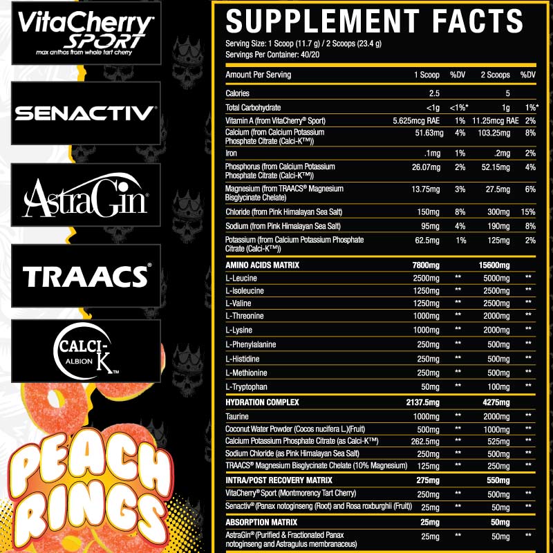 L-LeucineL-IsoleucineL-ValineL-ThreonineL-LysineL-PhenylalanineL-HistidineL-MethionineL-TryptophanTaurineCoconut Water Powder (Cocos nucifera L.)(Fruit)Calcium Potassium Phosphate Citrate (as Calci-K™)Sodium Chloride (as Pink Himalayan Sea Salt)TRAACS® Magnesium Bisglycinate Chelate (10% Magnesium)VitaCherry® Sport (Montmorency Tart Cherry)Senactiv® (Panax notoginseng (Root) and Rosa roxburghii (Fruit))AstraGin® (Purified & Fractionated Panax notoginseng and Astragalus membranaceus)