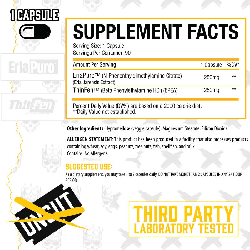 "Eria+ caps combine 250mg of trademarked EriaPuro with 250mg of Thinfen Beta Pea; this combination is going to provide a quick hitting but long lasting mood elevation, clear headed and feeling of well being."